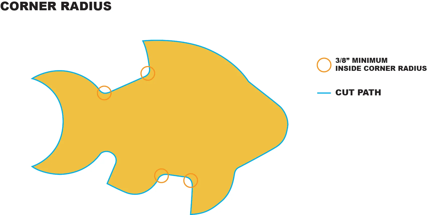 • For contour cuts on substrates thicker than 1/8” (.125), all inside cuts will require 3/8” or 0.375 radius.