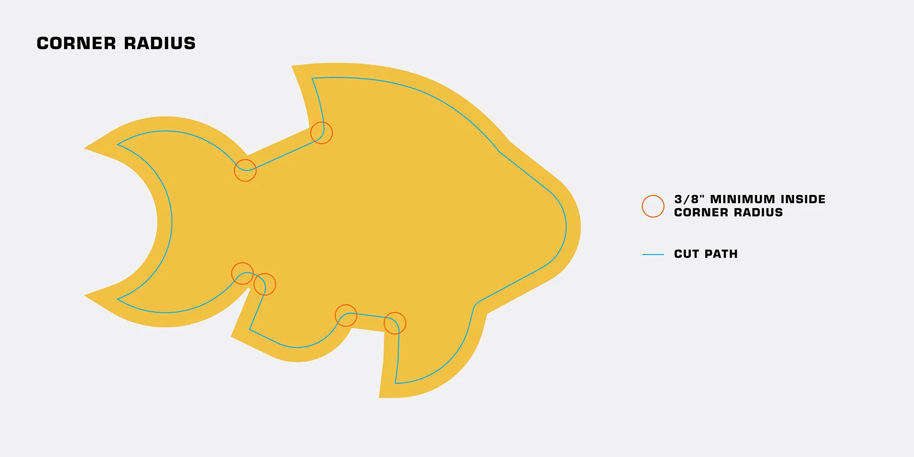 - For custom cuts on substrates thicker than 1/8” (.125), all inside cuts will require 3/8” or 0.375 radius.