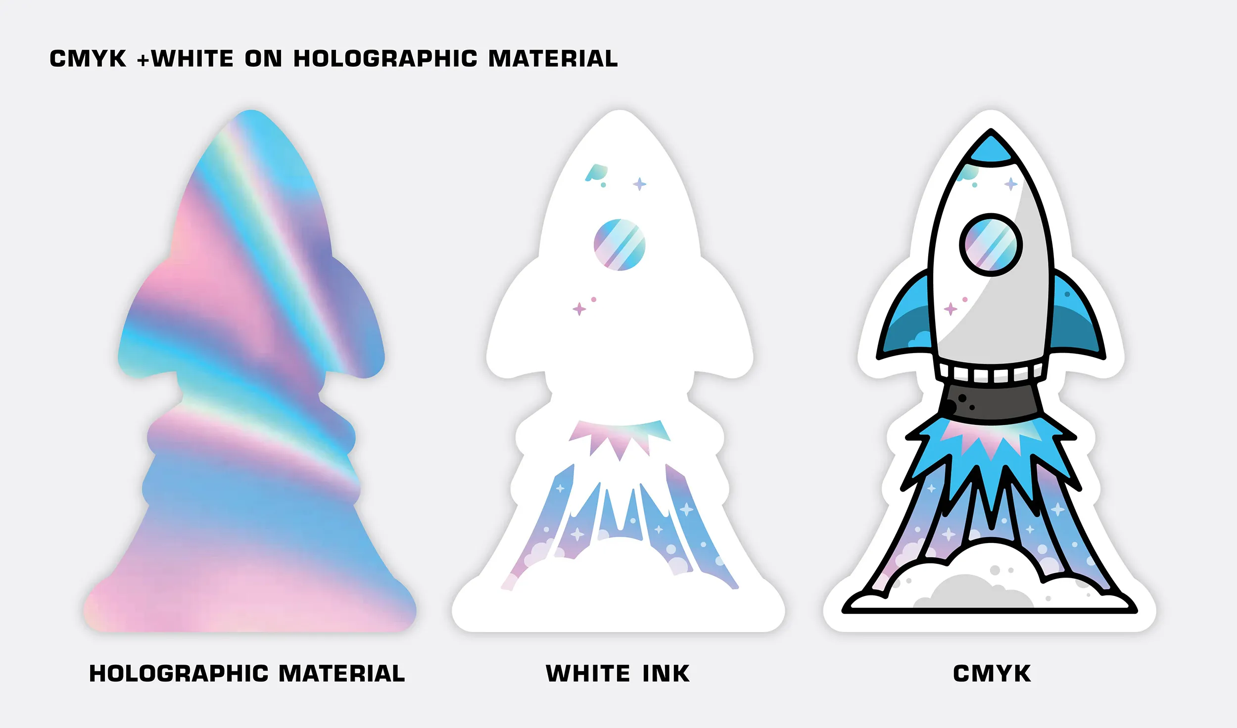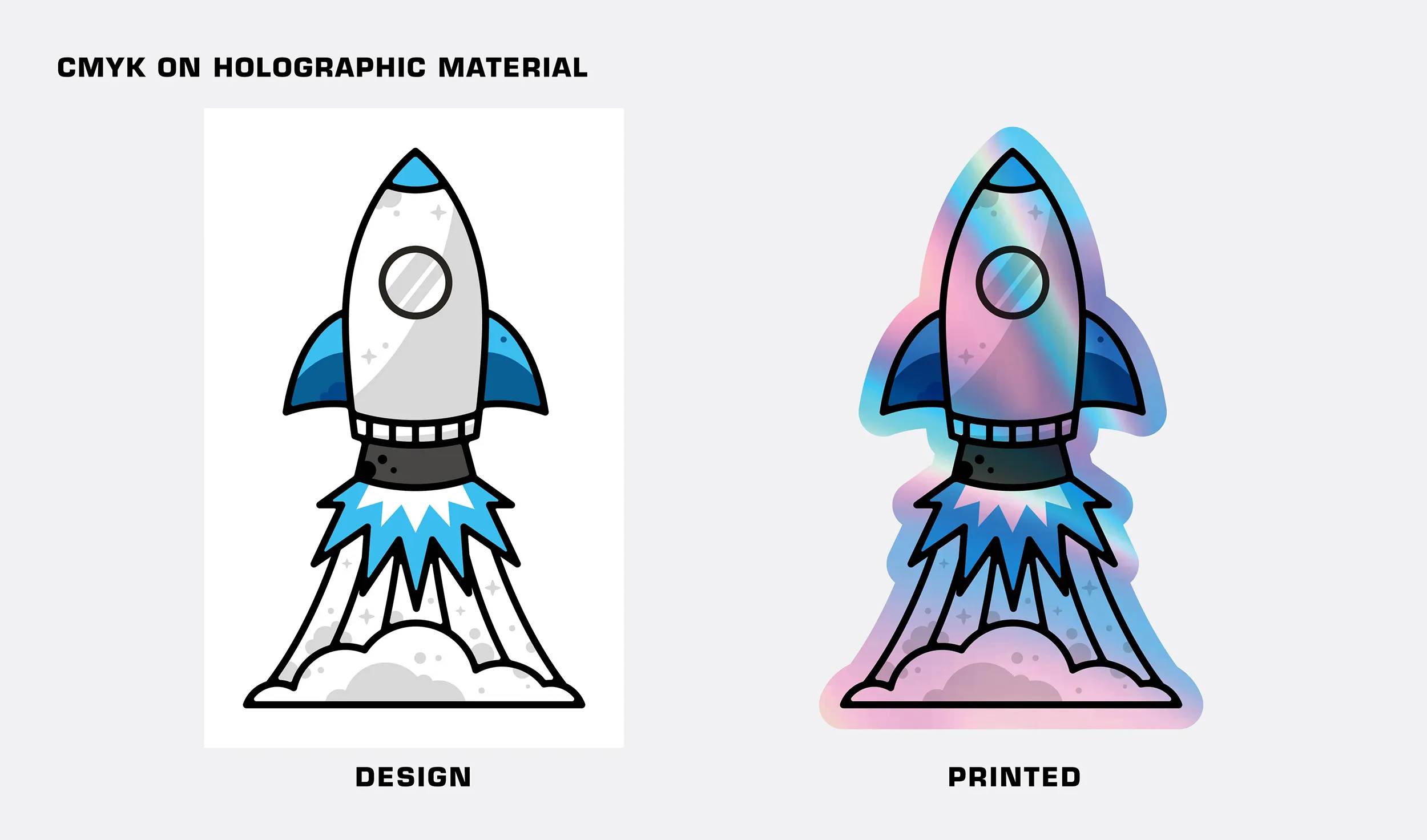 - The white layer is printed on the holographic material first, followed by the CMYK layer.