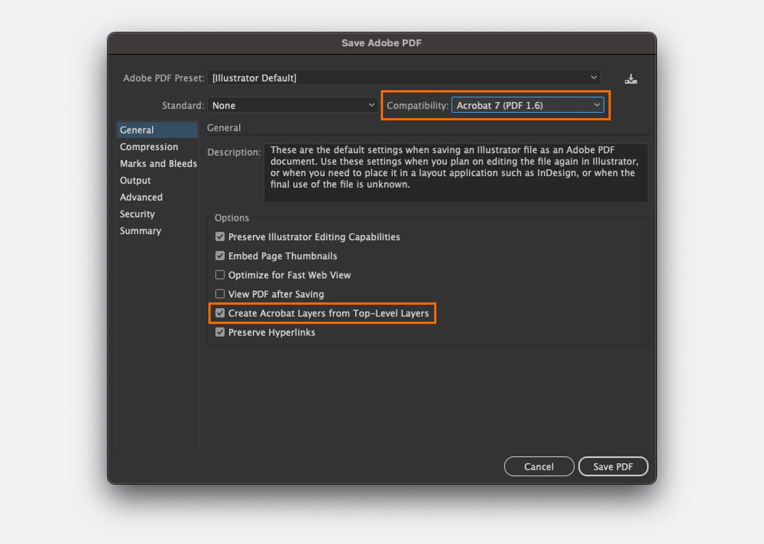 - Choose Adobe 7 (PDF 1.6) compatibility when saving your PDF to preserve your layers.