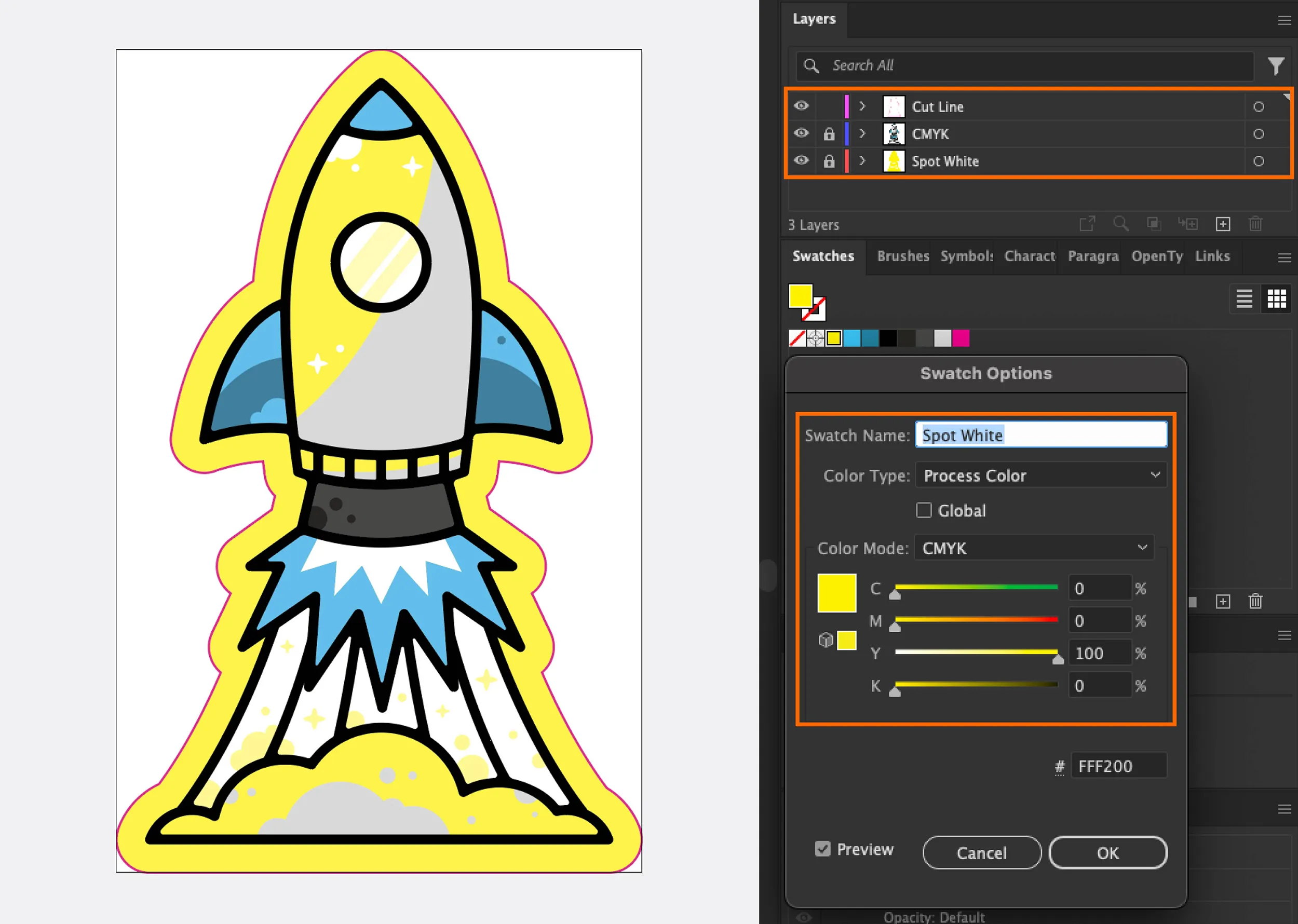 - Clearly label your Spot White layer as “Spot White” and your CMYK layer as “CMYK”.