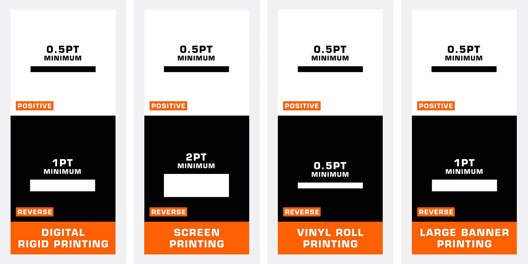 - Large Format Banners Minimum of 0.5pt for positive line widths and 1pt for reverse line widths